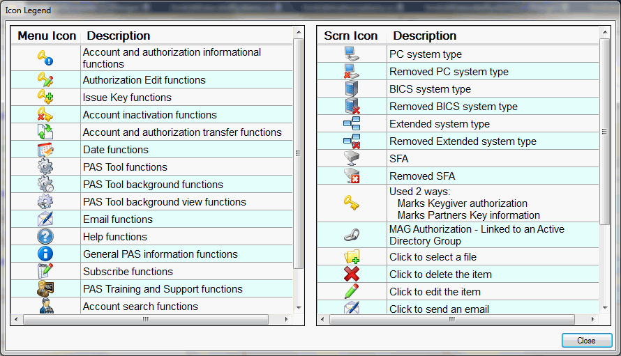 The Personnel Authorizations System (PAS) uses many different icons to represent information within the system. The Icon Legend lists the various images and gives a brief description of what each image means. Some images can be clicked to invoke an action.
